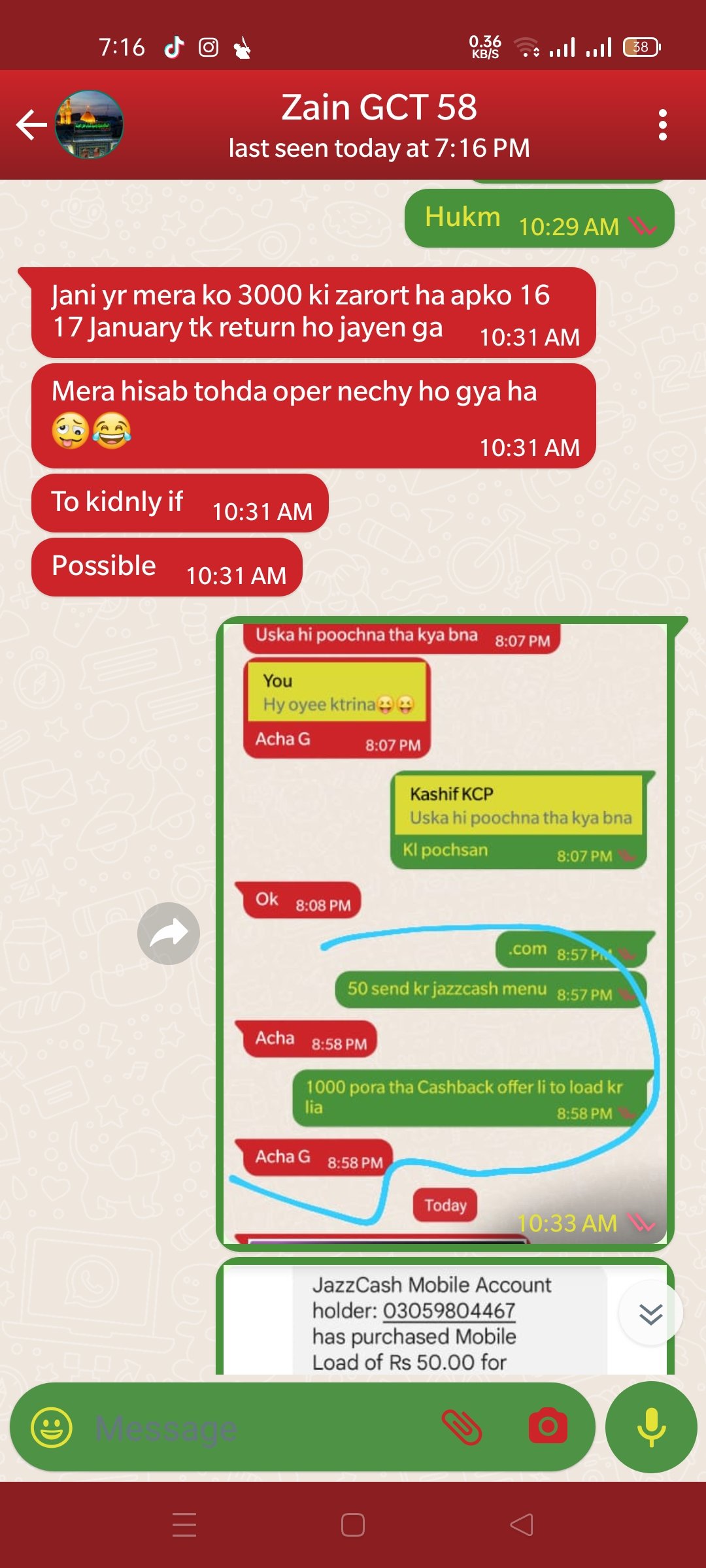 I checked my account balance it was about to end there was rs 2only credit so i open my jazzcash account and make a load of 50 rs from my account because i was need only 50 ruppes