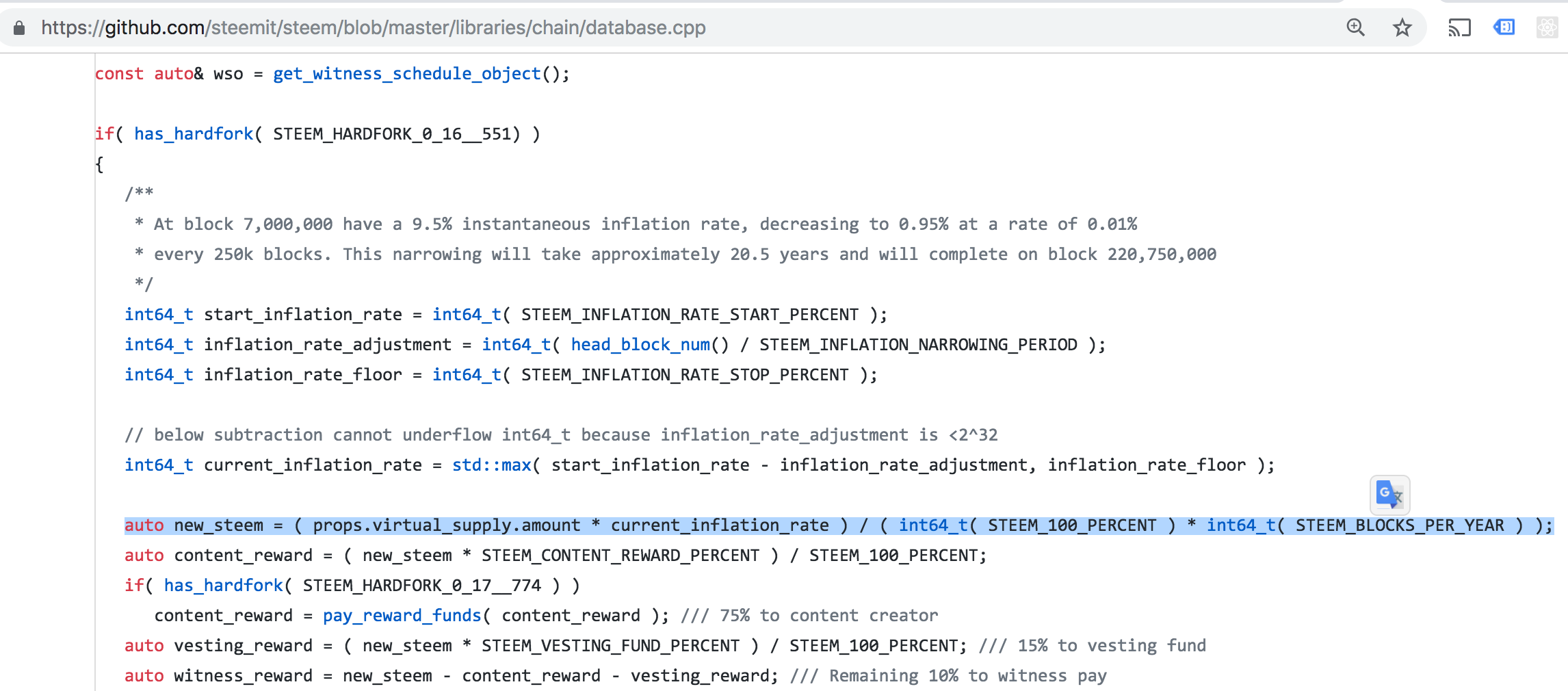 auto new_steem = ( props.virtual_supply.amount * current_inflation_rate ) / ( int64_t( STEEM_100_PERCENT ) * int64_t( STEEM_BLOCKS_PER_YEAR ) );