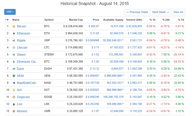 As you can see, the prices were much less volatile back then, moving hardly even 1% a day sometimes. It didn't even require billions to be in the top of the market cap, either! I like where Steem is at in this list (; A very healthy 5th Place in the list. Things were much simpler back then! The competition wasn't nearly as fierce! Now, the amount of innovation has driven almost every good idea into the crypto-world, to be turned into it's own platform, token, etc.