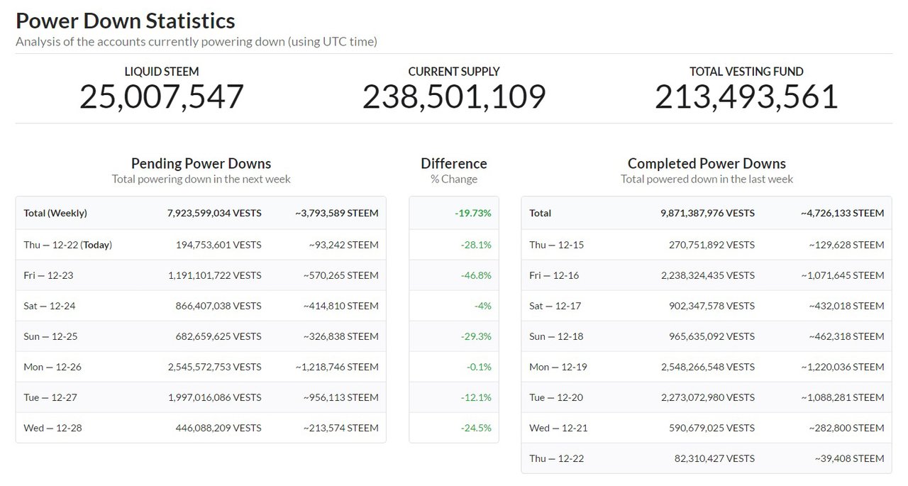 I’ll leave you on a bit of a positive note today: the weekly power down statistics from Steemdb. There’s a full week of green ahead!