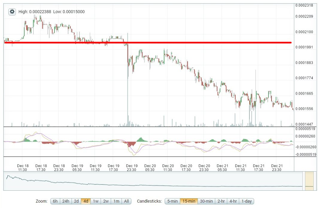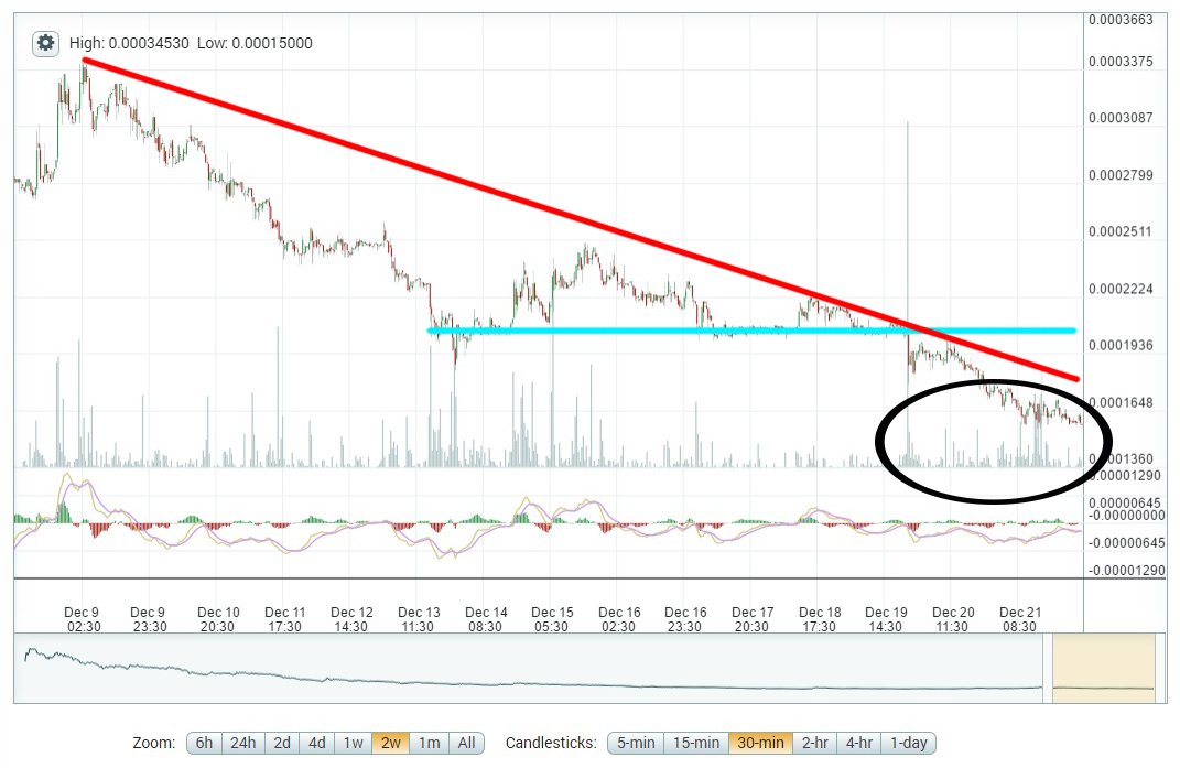 Buy orders are quickly stacking up on the Poloniex exchange, but whether they’ll be enough to prevent a further move downward is the question. Currently, there is a fairly large wall right around $0.13, with buy orders totaling 32 BTC or ~$27,000. Behind that is another wall around $0.10, with orders totaling 79.5 BTC or ~$67,000.