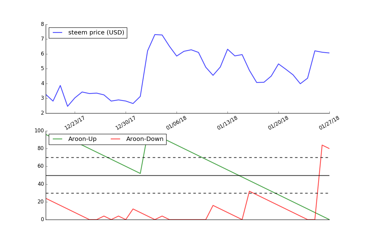 The graph below shows the Aroon Indicator using the price of Steem over the last 40 days.