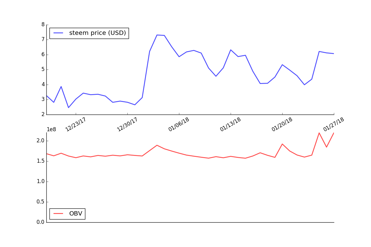 The graph below shows the OBV applied to the price of Steem using daily price data for the last 40 days.