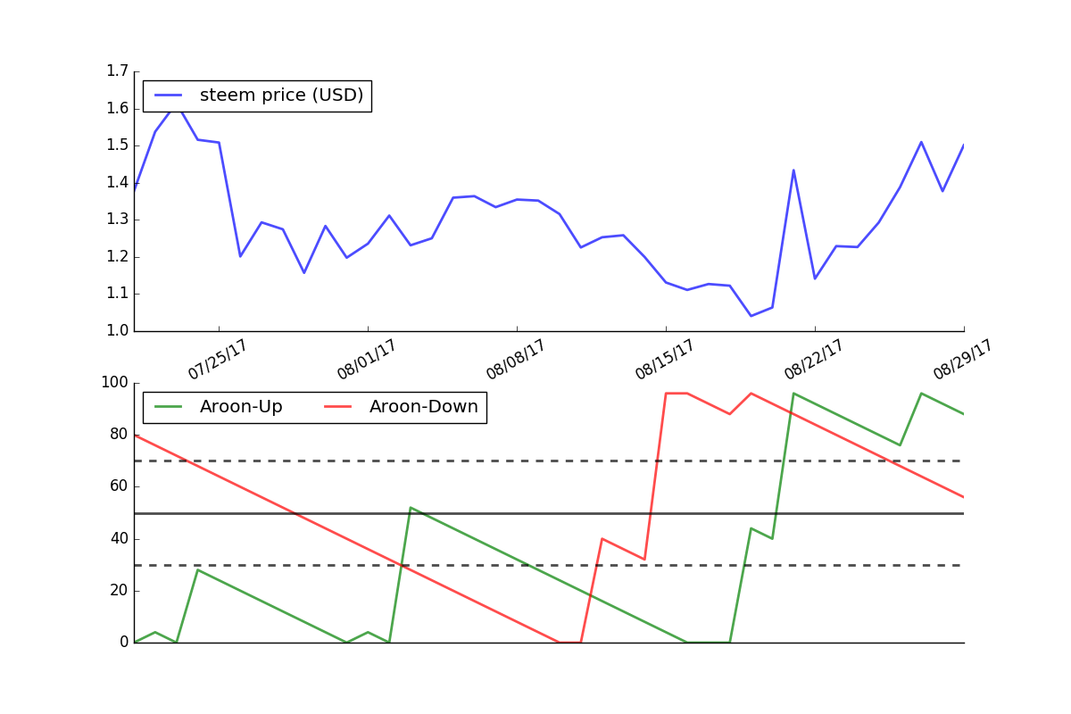 The graph below shows the Aroon Indicator using the price of Steem over the last 40 days.