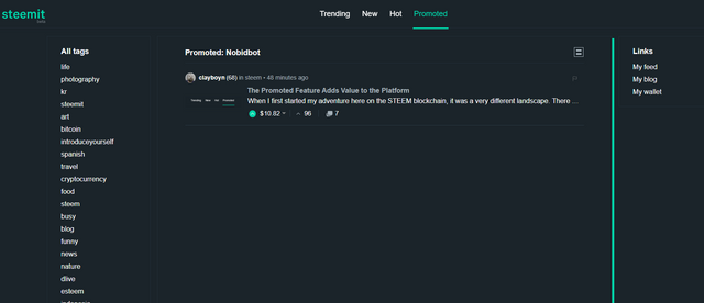 When I first started my adventure here on the STEEM blockchain, it was a very different landscape. There were no bidbots, there were no alternative front ends, like the one I'm using now, Busy.org, and the way things worked was very different. I remember being a new user and using the promoted tab to actually gain exposure and find content and it's not something I really talk about much anymore, but I still check the promoted tab. Today I want to talk about why I think that the Promoted tab and using the promoted system is something we should get back to doing as a community.