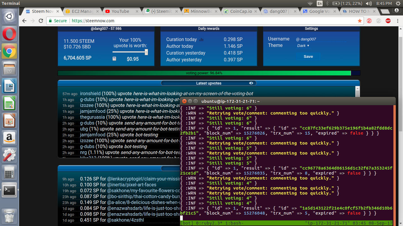 Pic of voting botsteemCreated with Sketch.dang007 (61)in #steem • 8 years ago Here is bot getting ready to vote screen shot pic. Look at the voting percent at 98% power so it already start voting. Look at 97% pic of the power on steemnow.com This is 96% of the power left. #steemit #bot #vote #money
