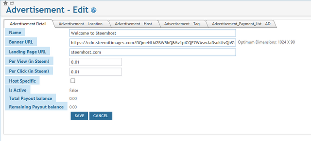 When creating an advertisement there are some specific criteria that you might want to indicate. For instance you may wish to adjust the image, landing page, the payout and whether the advertisement is Host specific. The first three are fairly straightforward. The rewards are a consideration which will change over time. Currently 1 steem is worth roughly 3 cents. Within the near future, steem could be worth 10 times or 100 times the current price (here's hoping). As the value of steem appreciates against the value of fiat money, this can/will be adjusted.