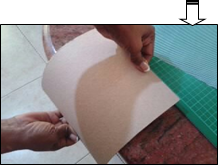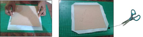 One of the rectangles of cloth is placed on the table, with the upside down, and then the cardboard with the glue is placed on the cloth, trying to center it. Then cut at an angle each of the equines 0.5 mm from the fabric. This step is very important to achieve a better finish.