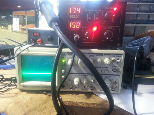 Although this is a little back lit, the three pieces of equipment that you see in this picture were all paid for by proceeds from Steemit. The top right is a soldering / rework rig that I really love. It comes up to temperature in about 25 seconds. I love it. It came with a selection of tips and be used to rework/solder SMDs. Or know as surface mount devices.