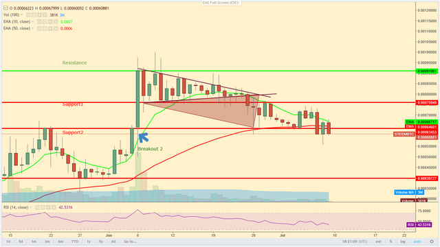 - Breakdown: Steem has broken a important support level of 63k satoshi. Though steem is playing with level, one day breakout other day break down, but these seesaw movements just making this support level fragile.