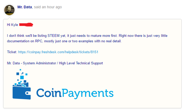 The fact that even when paid $500 USD to implement the STEEM wallet into their system the Coinpayments.net's Administrator refused and was unsure about STEEM due to it's lack of proper documentation...