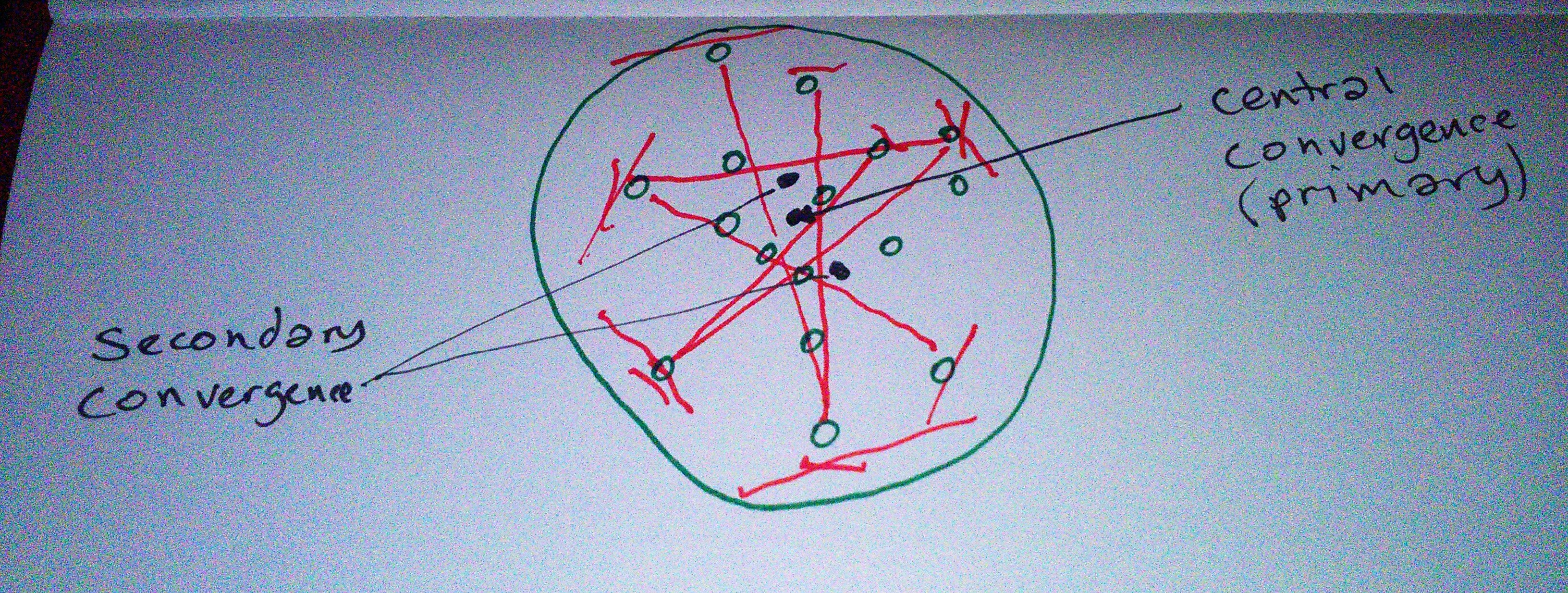 The green circles are the nodes, their distance from each other is closer the more transacions with each other, the red lines I draw between distant points creates what you can see will generate crisscrossing lines which centre around a midpoint. Then in black I show the single center versus the dual center.
