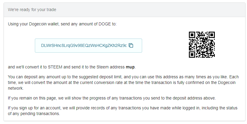 Insert a bigger amount! You can deposit any amount up to the suggested deposit limit, and you can use this address as many times as you like. Each time, we will convert the amount at the current conversion rate at the time the transaction is fully confirmed on the Dogecoin network.