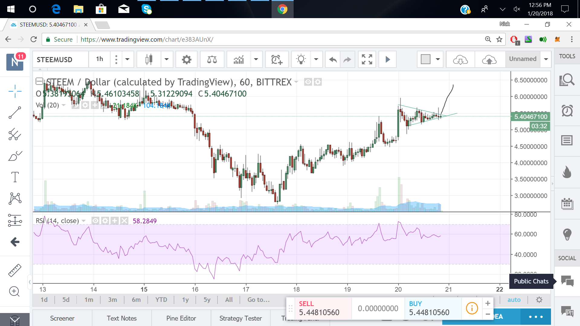 After breaking out yesterday, both steem and SBD's have been forming consolidation patterns in the shape of bullish flags. This occurs when the price of the security is making lower highs and higher lows and is in a tightening range. These patterns are very healthy in a strong market! Also, these patterns tend to end in the same way that they started. What that means is that since they broke out before entering this pattern, they will most likely both breakout to higher levels once again!