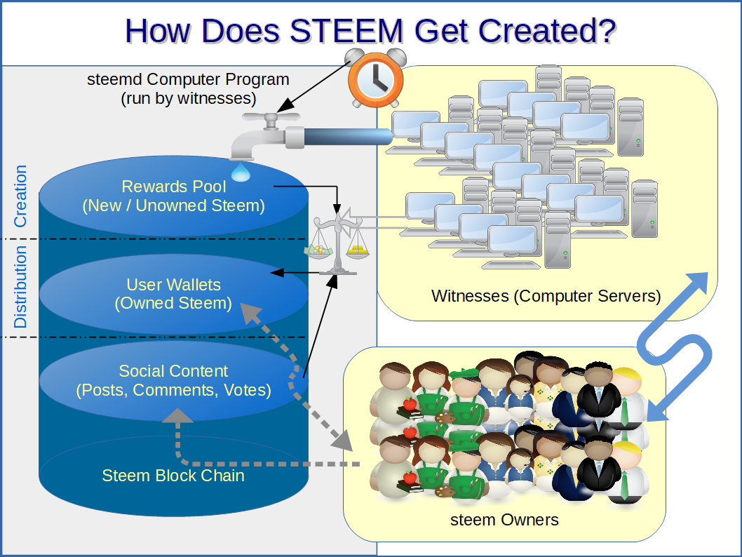 New steem is created by the witnesses at a scheduled rate. The faucet depicts witnesses pouring new steem into the rewards pool where the faucet handle managing the rate is controlled by the clock.