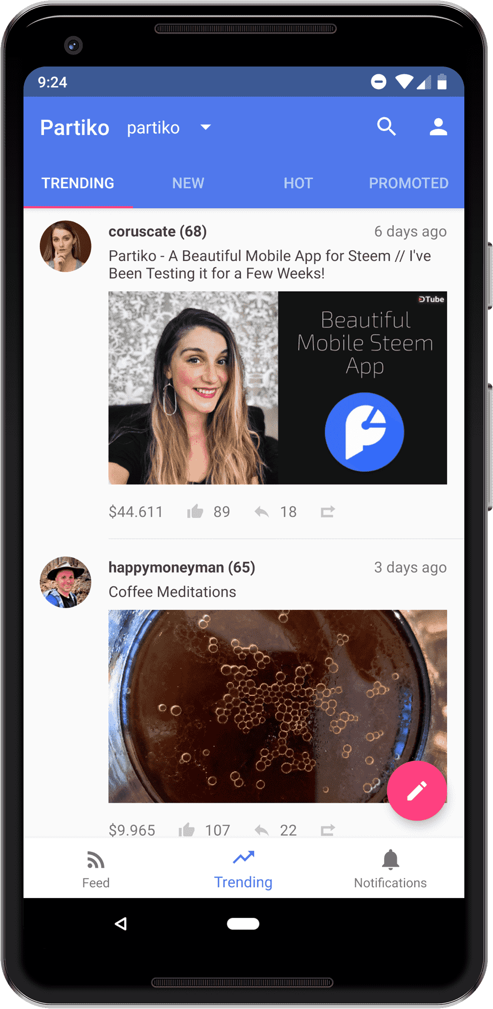 - Bonus: As with any good smartphone app, of course, you are provided notifications of all activity in Steem related to your account. But, also everything you do in Partiko generates points, which are redeemable for upvotes!