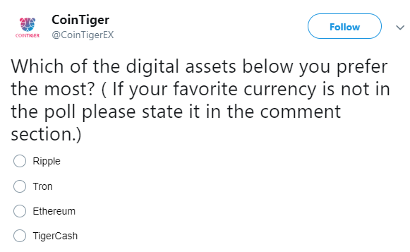 CoinTiger, an exchange with a reported 24h volume in the range of 300-500 million USD is currently running a poll where they asked their Twitter followers: