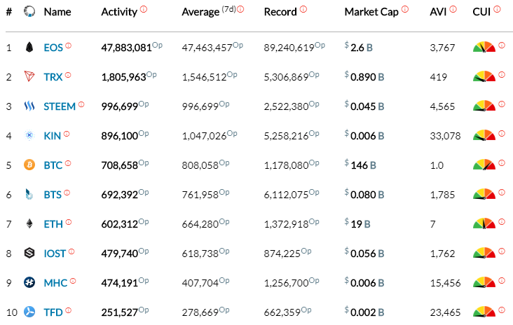 The "AVI" in the screenshot is the crypto's Activity Valuation Index. In a nutshell the higher the number the better. It's worked out by a blockchain total transactions compared to bitcoins and then divided by marketcap are something like that. The higher the better. Lastly is the "CUI" which is a blockchain capacity meter. We can see that EOS is sitting in yellow with it's 47 million transactions per day. Bitcoin is starting get into ad shape with 700k transactions so if it get's used more, fees and transaction time will both increase. STEEM is flat lining show that 1 million transactions is a walk in the park and what's that? Transaction confirmed in 3 seconds? Im sold!!