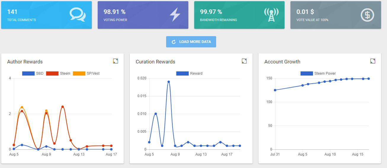 This is the top the dashboard it shows your VP, bandwidth ,vote value, as well as a few graphs to show account growth and rewards.
