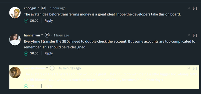 And finally It would be nice if steemit could show users's avatar in the wallet transactions/follower list,etc..it makes it more user friendly. Also showing avatar of the person before transfering money would go along way to make the user experience better.