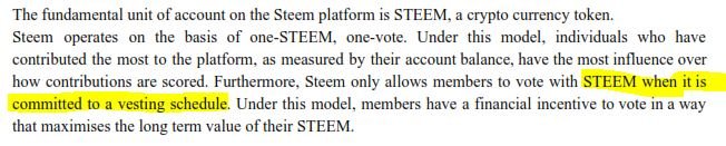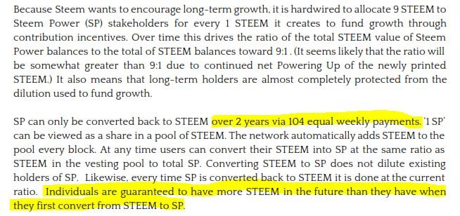 - These two paragraphs in 'Steem Power' under 'Ways to Contribute" highlights key updates 1. 104 to 13 weeks vesting schedule, importance of Steem Power in users' influence in the platform, and disambiguation of the interest paid to long term commitment via holding of Steem Power.