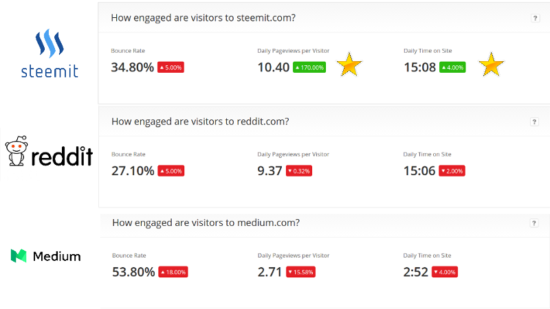 Engagement is looking good versus Reddit. However, do note that Reddit has many dozens of millions of casual users who would only browse for a bit. I don't know how this will play in the long run, but certainly Steemit's engagement numbers are off the charts for a brand new site.