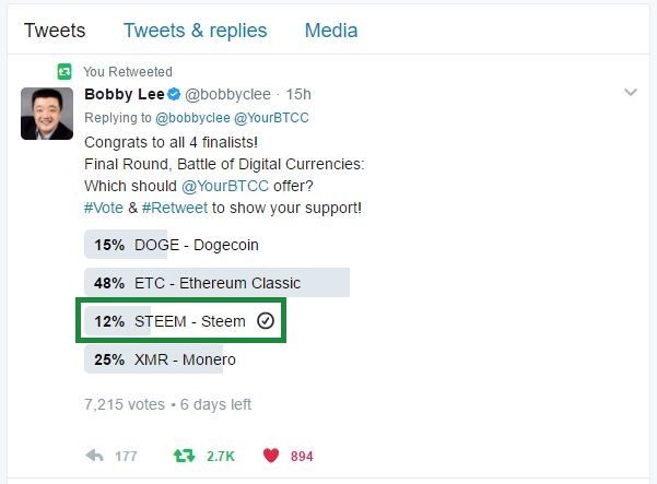 Congrats to all 4 finalists (STEEM, XMR, DOGE & ETC)! - Final Round, Battle of Digital Currencies.tonyson4078 (49)in #steem • 8 years ago (edited)We have 6 days left. https://twitter.com/bobbyclee/status/865851769116475392 NEEDS YOUR HELP #steemit #news #vote #community