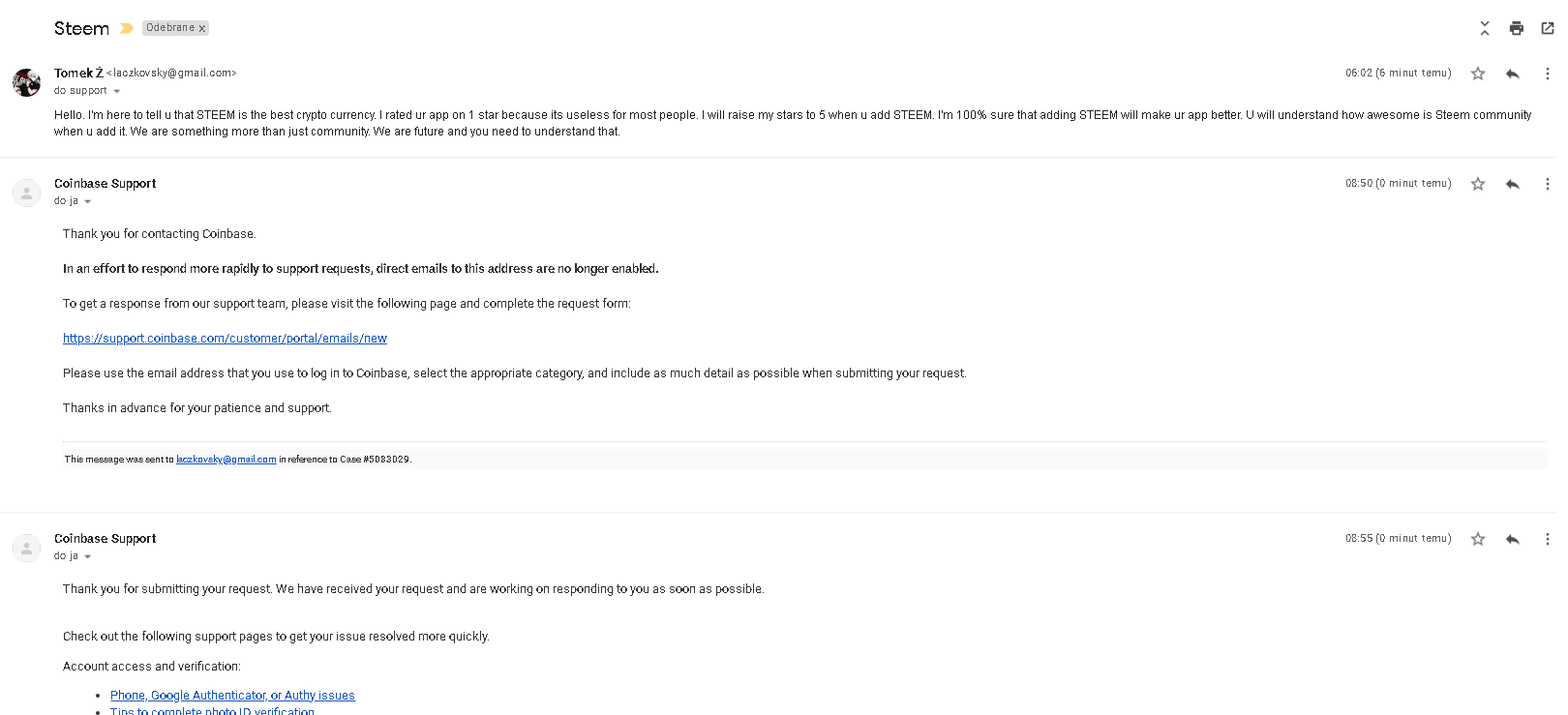 You are viewing a single comment's thread from:RE: STEEM & Coinbase CampaignView the full contextView the direct parenttxmek (66)in #steem • 7 years ago Motherfuckers turned off direct messages so I messaged them through their site and I got email that they got my message and they will respond soon: