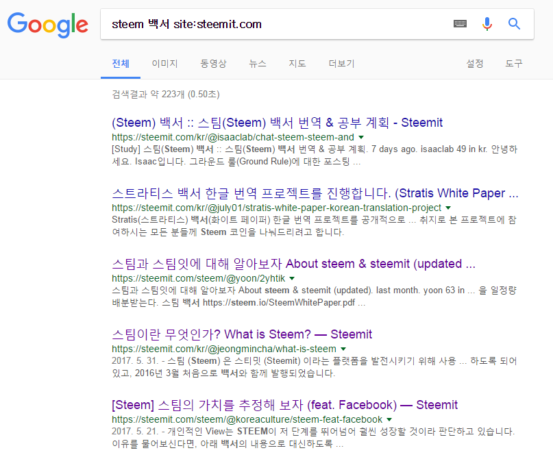 사실 검색엔진으로 구글을 쓰는 분이라면, 이정도의 검색은 '구글'에서 사이트 주소만 넣으면 간단하게 할 수 있습니다. 찾으려는 키워드 뒤에 "site:steemit.com"이라고 넣어주기만 하면 스팀잇 내의 글을 검색할 수 있습니다.