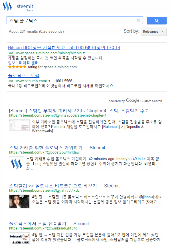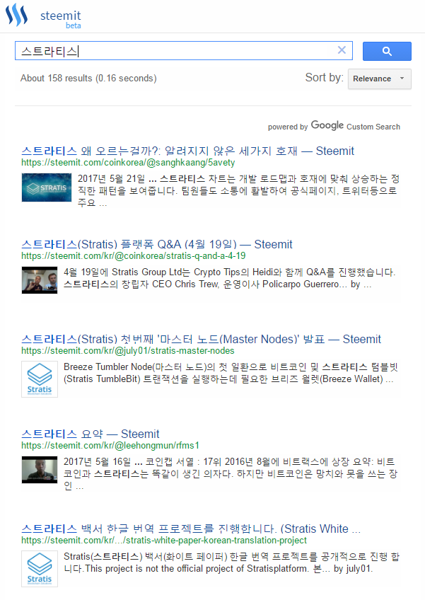 처음에는 눌러보고 '그냥 구글 검색이잖아' 하고 마는 분들도 계시겠지만, 검색해보면 스팀잇에 작성된 글이 검색됩니다. 찾으려는 키워드를 넣고 검색하면 간편하게 결과를 찾을 수 있습니다.