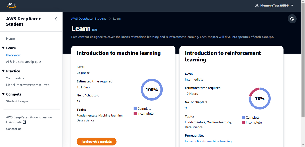 A few days ago, I completed the lesson on Machine learning. Today, I started the lesson on Reinforcement learning and after that, I will take the quiz which will qualify me to apply for the AWS scholarship. Similarly, I will be looking forward to competing in the DeepRacer Student League where I will build my own machine learning model for the competition.