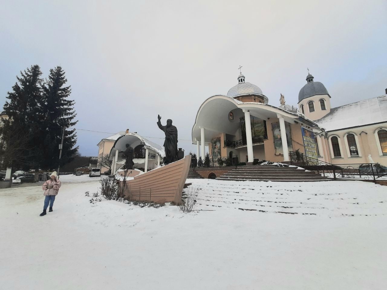 Було дуже холодно в цей день, коли я ходила по подвір'ю церкви і робила багато фото на пам'ять про це місце. Тут є декілька окремих будівель і красива дзвіниця з трьома дзвонами. На подвірї церкви стоїть статуя матері Божої. В нашій релігії люди дуже вірять та надіються на її опіку та ласку. І на куполі церкви також є скульптура матері Божої, яка наче своїм покровом з висоти захищає своїх улюблених дітей.