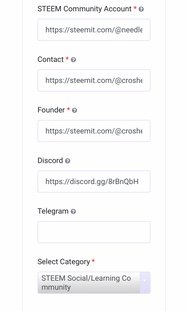 Finally the contact section! Who do we contact to ask questions and get more information? Here you list the url for the community account, the contact for the community, the founder and the Discord link.