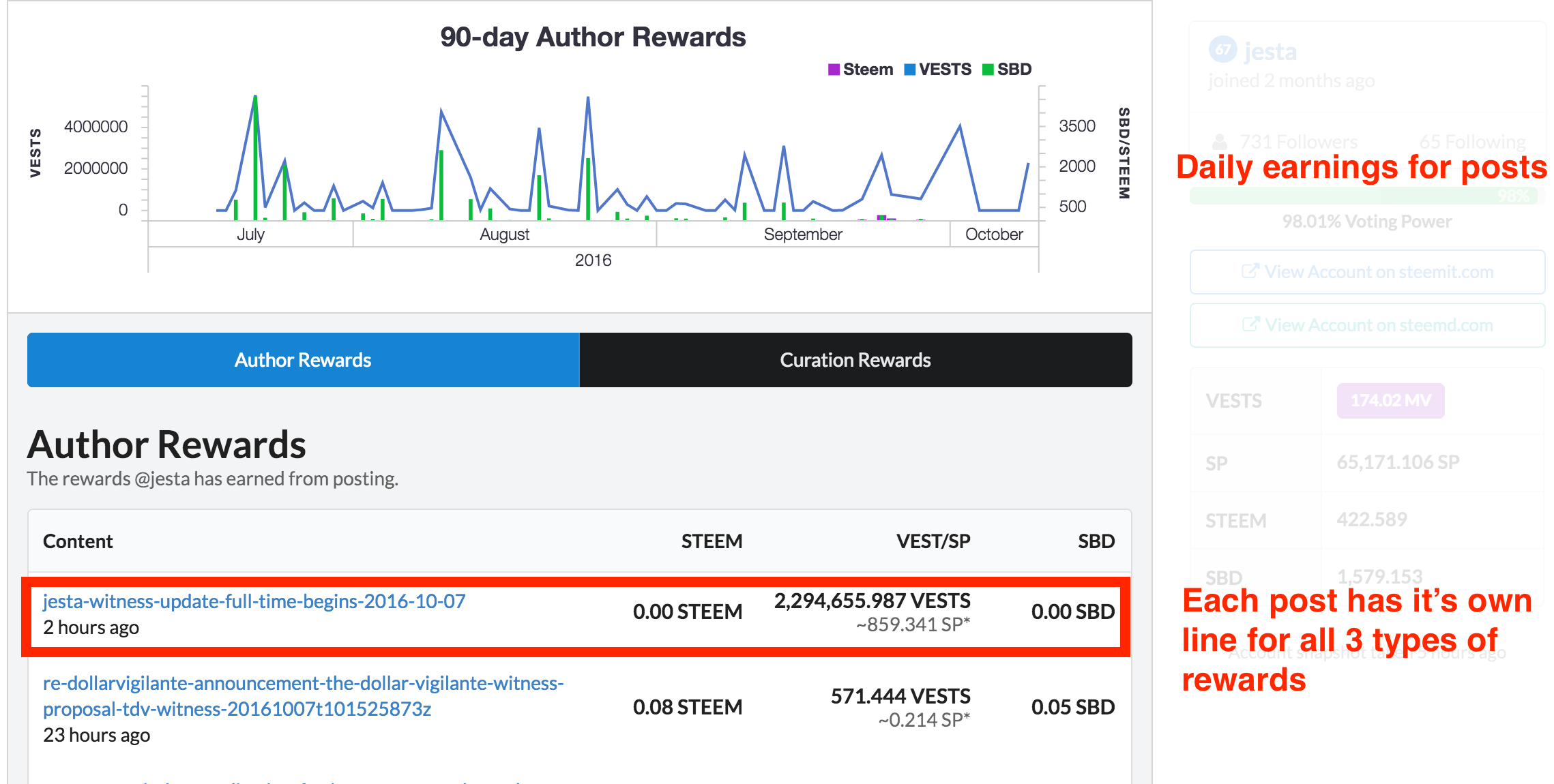 This screenshot and associated link shows off the new author rewards page. Similar to the curation rewards page, this page shows rewards for all of the posts and comments you've ever written. Currently there is no way to filter between the two types of posts easily, but it's something on my radar to improve.