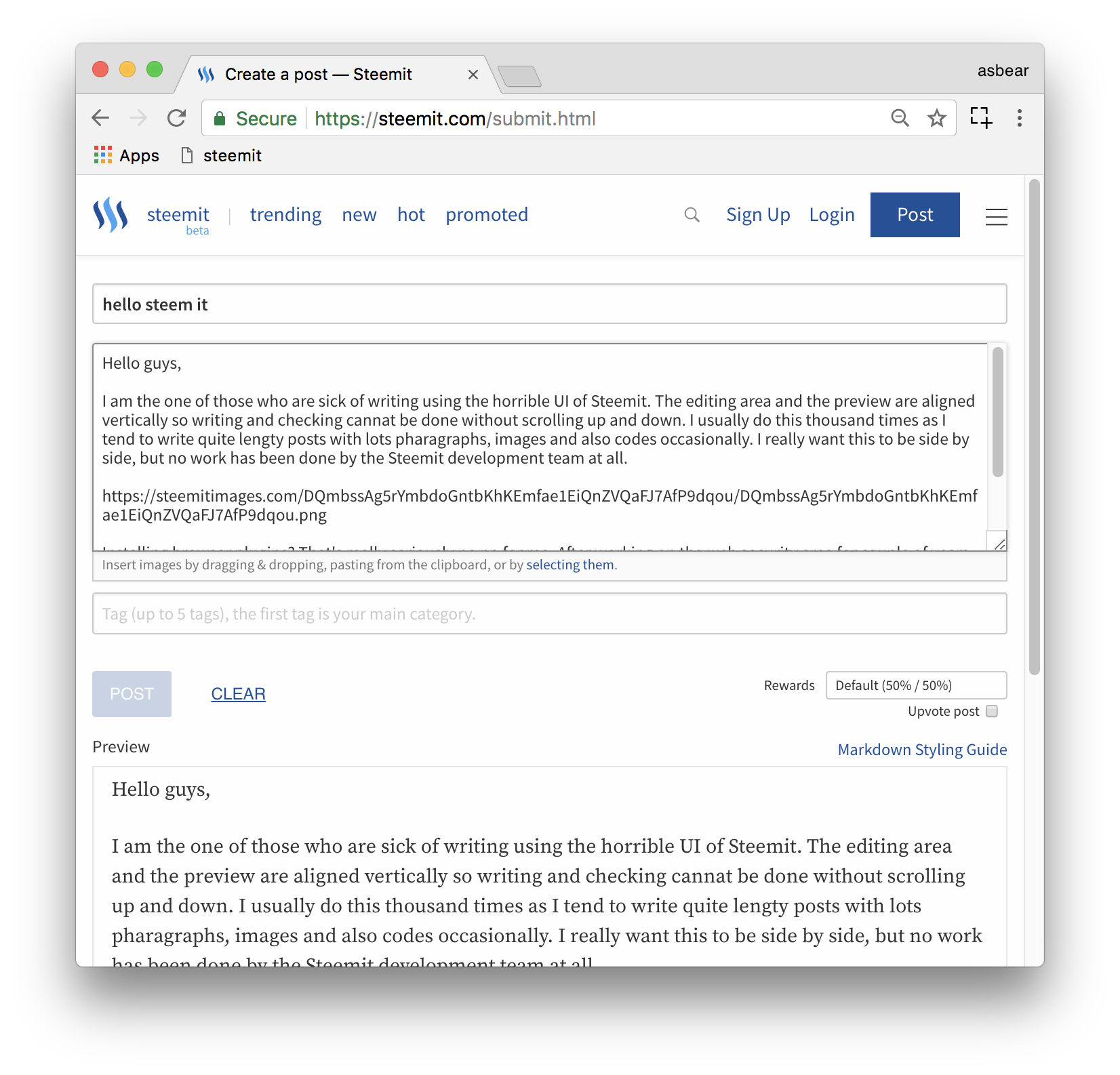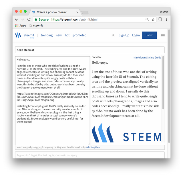I am the one of those who are sick of writing using the horrible posting UI. The editing area and the preview are aligned vertically so writing and checking cannat be done without scrolling up and down. I usually do this thousand times as I tend to write quite lengthy posts with lots of pharagraphs, images and also codes occasionally so that I end up with headache and stiff neck after finishing it. I really want this to be side by side, but no work has been done by the Steemit development team at all.