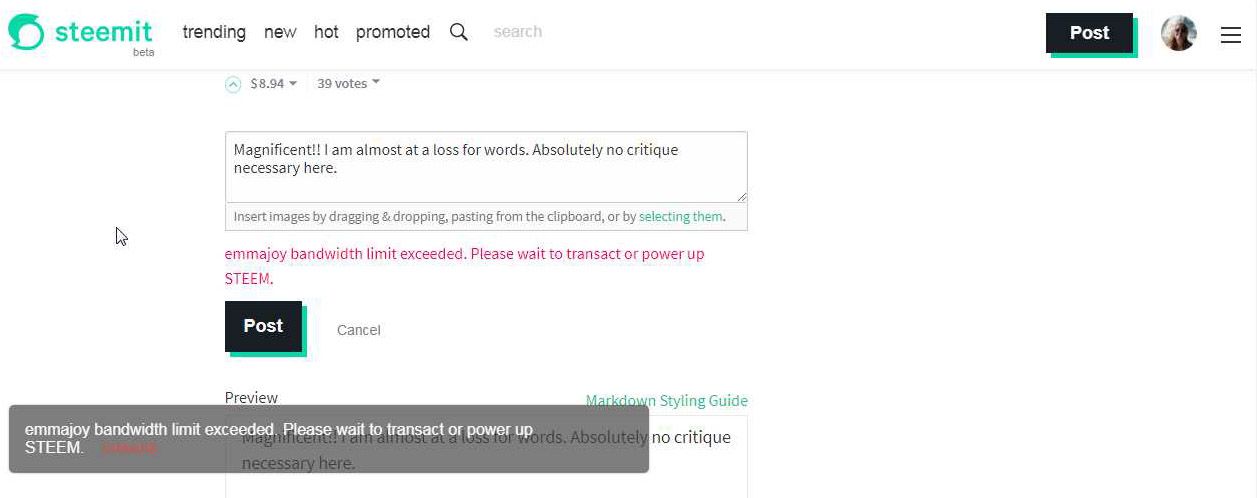 Another thing i noticed is that some people resteem anyhow and this can also cause the drainage. Resteeming a post means you want your own followers to see the post. It is not certain that someone that gets the low bandwith error will have a follower that can do justice to the post so please limit it.