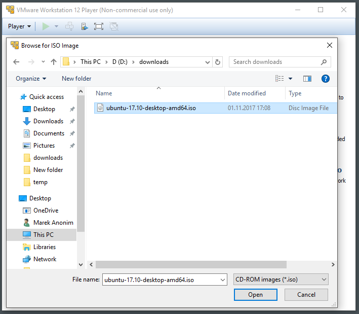 5. Go to the folder where you have saved the Ubuntu 17.10 iso file and select it