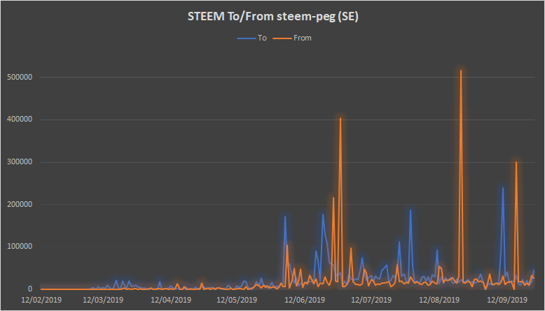 The chart above shows the daily transfer totals, to and from 'steem-peg'. I've excluded 'steem-peg' sending to/from 'steem-peg', but everything else is there. Unfortunately, the chart doesn't look so brill thanks to a couple of days where the transfers from 'steem-peg' were pretty big. The busiest day was on the 22nd of August where 516,000 STEEM was moved out of Steem Engine - 495,000 of that went to 'sct-wallet'. I didn't delve too much into that account but did notice that it's taken over 13,000 STEEM in the last 30 days in beneficiaries alone. Damn!