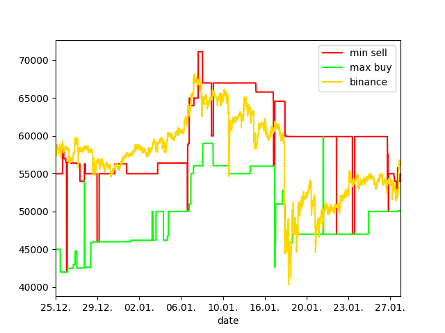 Keep in mind that when collecting the rates, dust orders are not taken into account (less than 0.0001 BTC or 0.001 LTC). The red line shows the lowest sell order (at this price, you can immediately buy) and the greenline indicates the highest buy order (meaning exactly the opposite). Then the yellow line shows us the price on Binance exchange where the price should be the most precise. LTCP price in STEEM is calculated by combining LTC/BTC and STEEM/BTC rates.