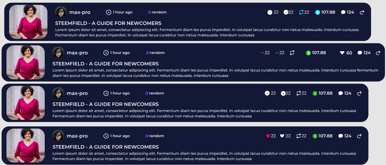 이전 포스팅에서 공지한 것처럼 "SteemField" 디자인은 Steempeak 사이트의 UX디자인을 참고하여 제작하고 있었습니다. 하지만 만족스러운 디자인이 아니기 때문에 자체적으로 2팀으로 나눠 디자인 작업을 진행했고 1차적인 샘플 디자인이 만들어졌기 때문에 디자인 공유를 해드립니다.