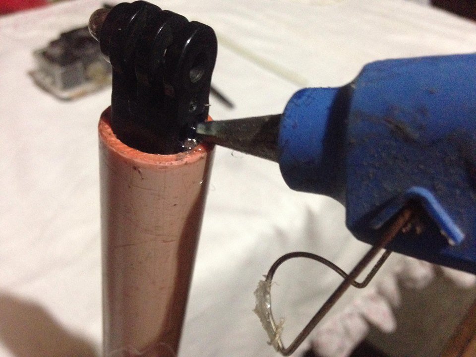 Get your glue gun and let it heat up then gather your already cut PVC pipe, extra stick glue and Mount extender. When your glue is already melting, pour a good amount of melted glue inside the bottom of the pipe. Refer (image 2.1)