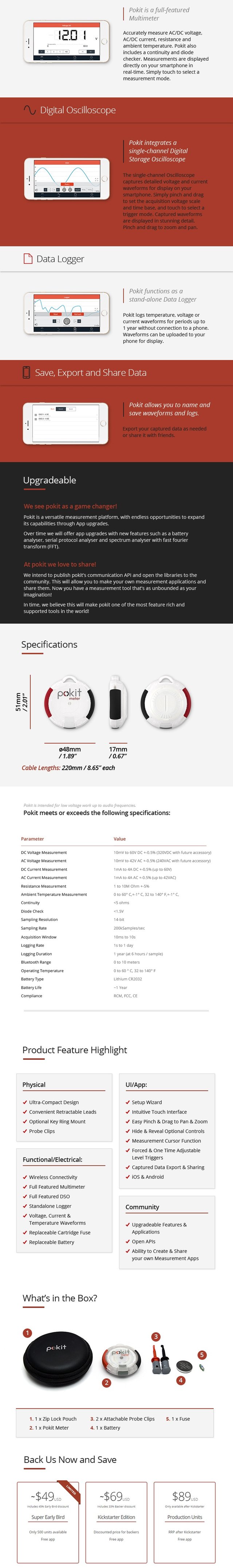 The key to the Pokit's small size is that ite uses the processing power and the display of your mobile device (ingenious), and it drastically reduces the amount of complex circuitry needed for it to function.
