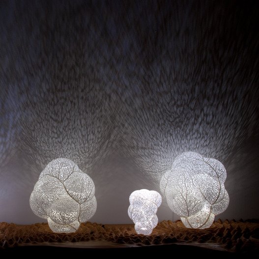 The Orbicular lamp is a series of table lamps based on how veins form in leaves. Each lamp is a completely one-of-a-kind design 3D-printed in nylon plastic with its own unique form and pattern of veins. The lamps are lit by eco-friendly LED's and cast dramatic branching shadows on the wall and ceiling.