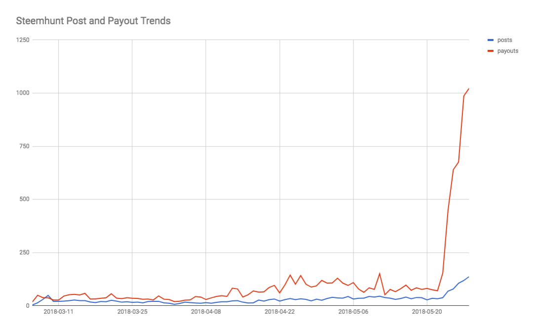 Over the past two weeks, it was a busy time for @steemhunt. Since our new SMT-based HUNT Platform announcement, the average posting count and daily hunter rewards have increased more than 300% and 150% each.