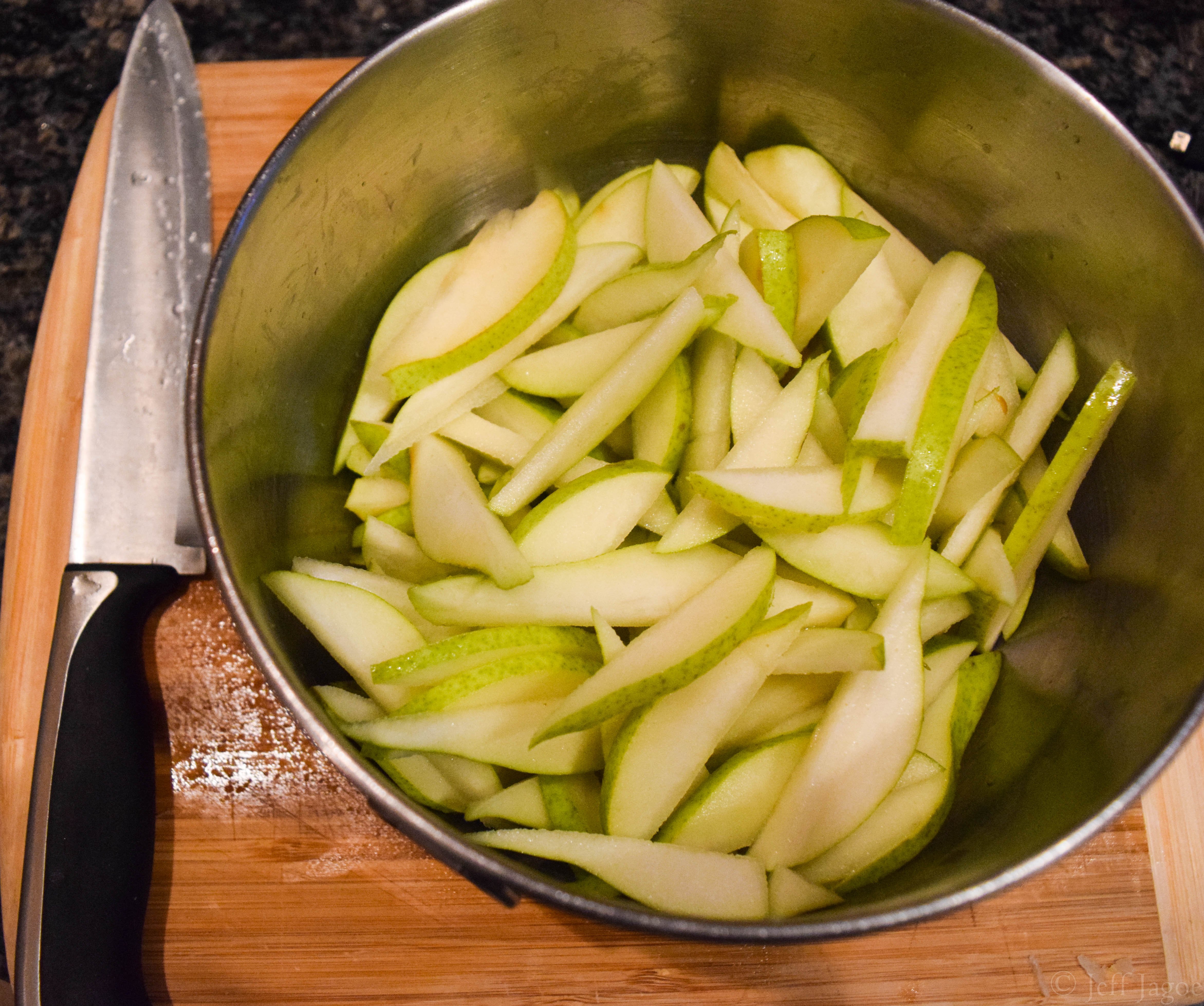 Core the pears and slice them into 1/2 inch thick pieces. Put them in a large bowl and toss them with the juice of 1/4 lemon.