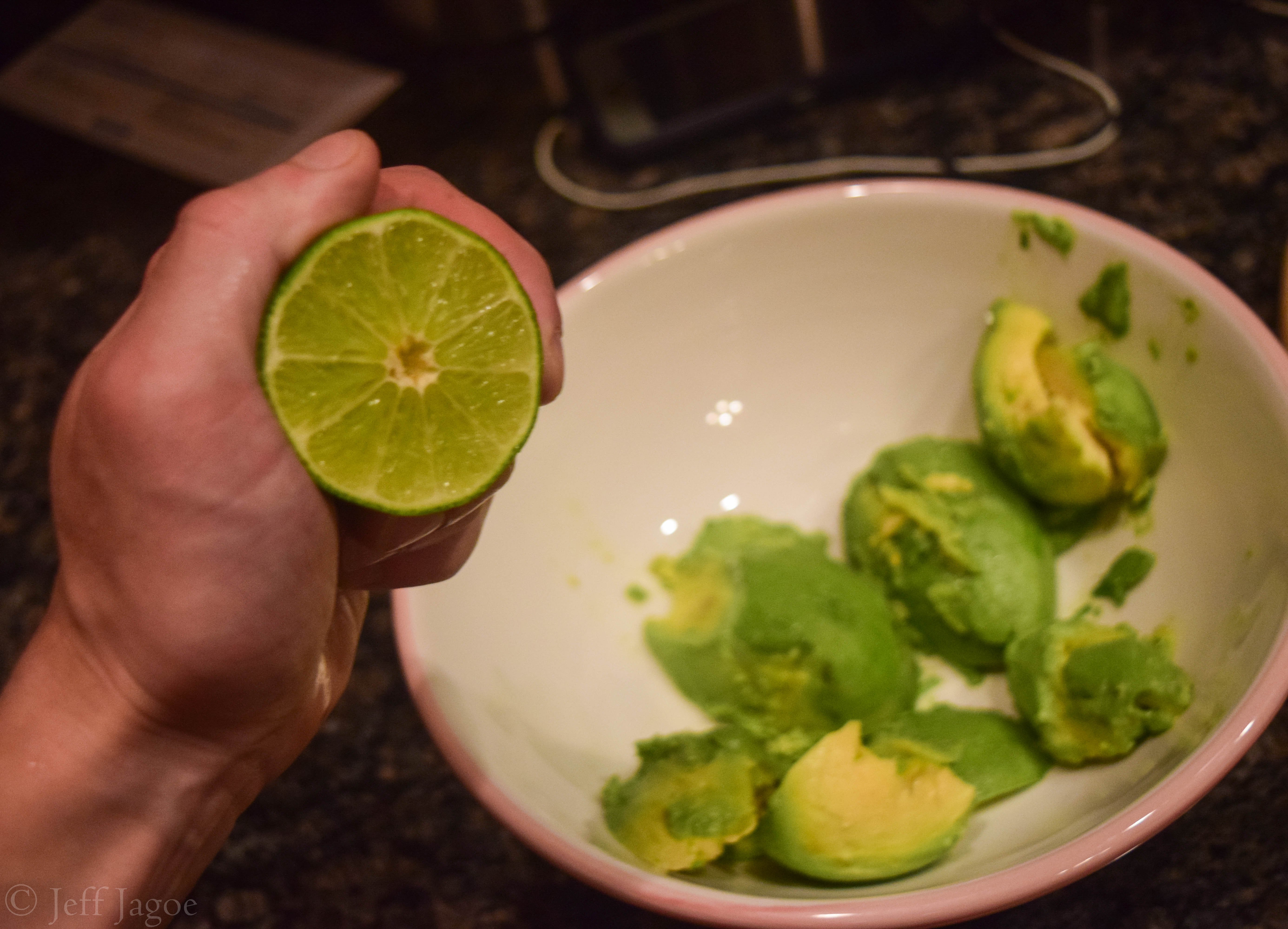 Scoop the 2 avocados out of their peel and put them in a large mixing bowl. Add the juice from 1 lime.