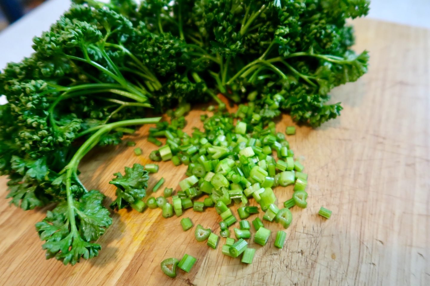 I chopped more parsley for decoration. The stems of the parsley also went into the pan...