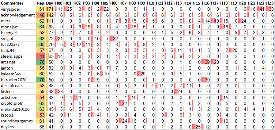 This shows the top 20 level 1 commenters and the number of level 1 comments posted at different hours of the day.