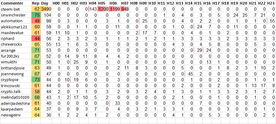 Here’s a look are the top level 1 commenters for 20190323. I’ve excluded known bots and curators from this but if anyone has any suggestions, they are most welcome. This serves to inform and you make you own decision whether they are the good, the bad or the ugly. I can only comment once every 20 seconds. Correction: I am only allowed to comment only once every 20 seconds. I type fast and sometimes get that annoying message quite a bit when responding and when I reply on my phone using voice typing, I get that even more. Anyway, 1,000 comments will need at least 333 minutes which is more than 5 and half hours. Hands up those of you who have spent more than 5 hours leaving comments at the first level.