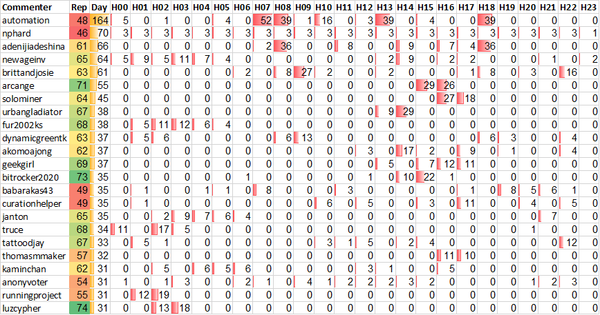 This shows the top 20 level 1 commenters and the number of level 1 comments posted at different hours of the day.
